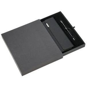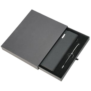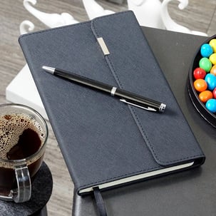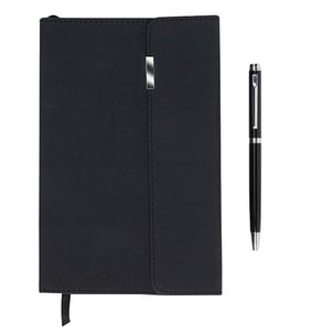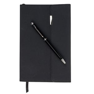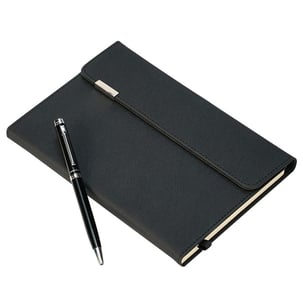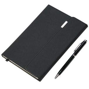 Incluye Bolígrafo y Libreta con cierre en ceja magnético, placa metálica para personalizar y cinta divisoria.